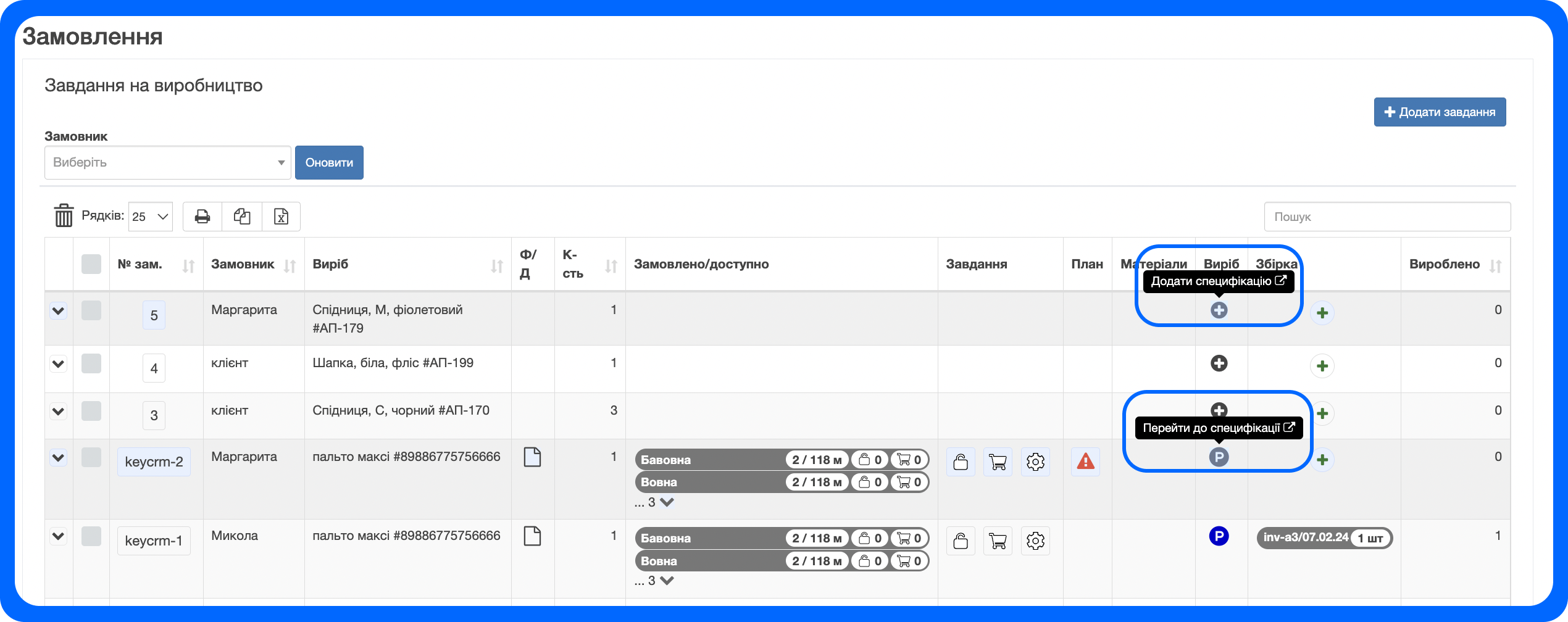 Спершу створіть специфікацію через “+” у колонці “Виріб”.