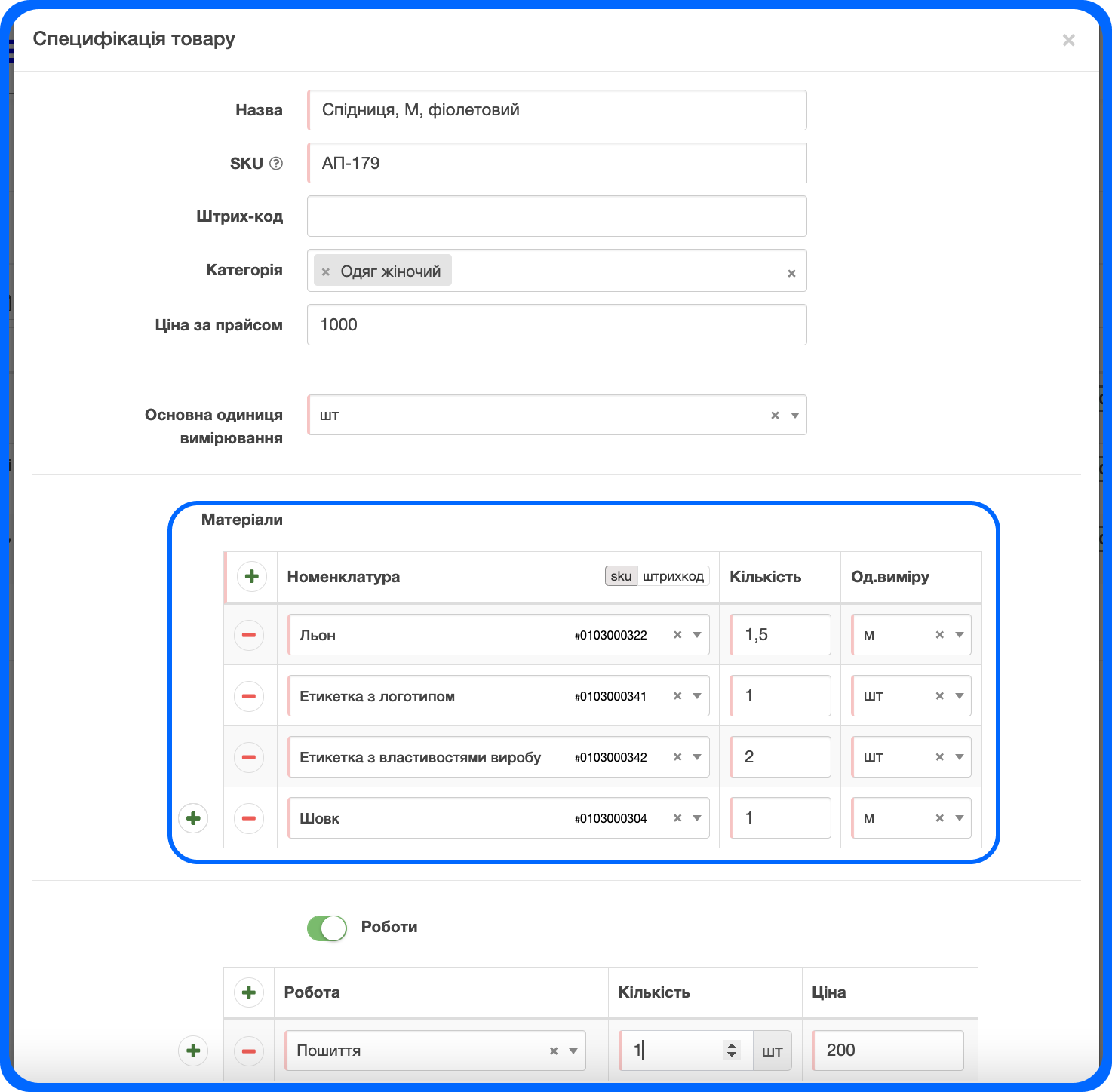 Після збереження у вас зʼявиться перелік матеріалів та доступні завдання для виробництва товару: