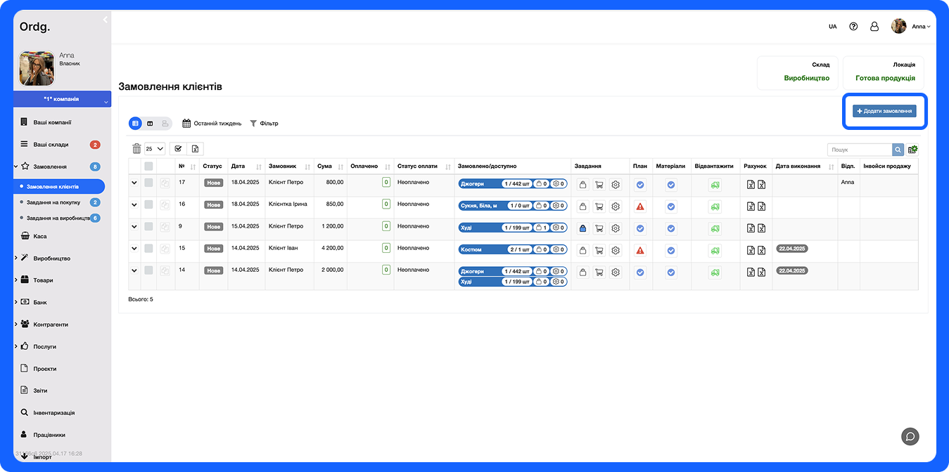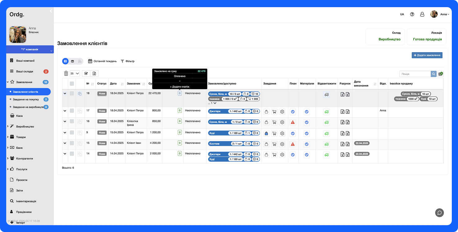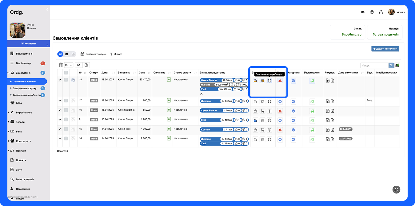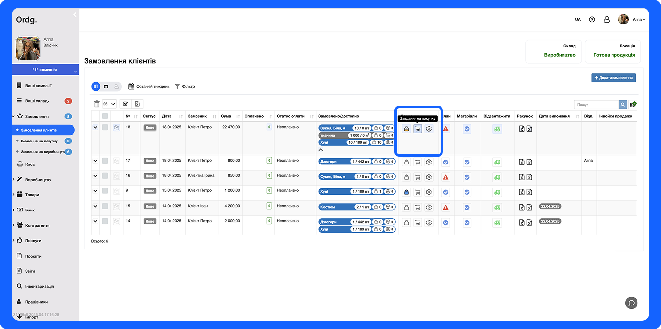 Замовлення клієнтів, це інструмент обліку замовлень, який дозволяє відслідковувати етапи замовлення і наявність товару на складі. Дає можливість планувати та створювати завдання на виробництво або покупку.