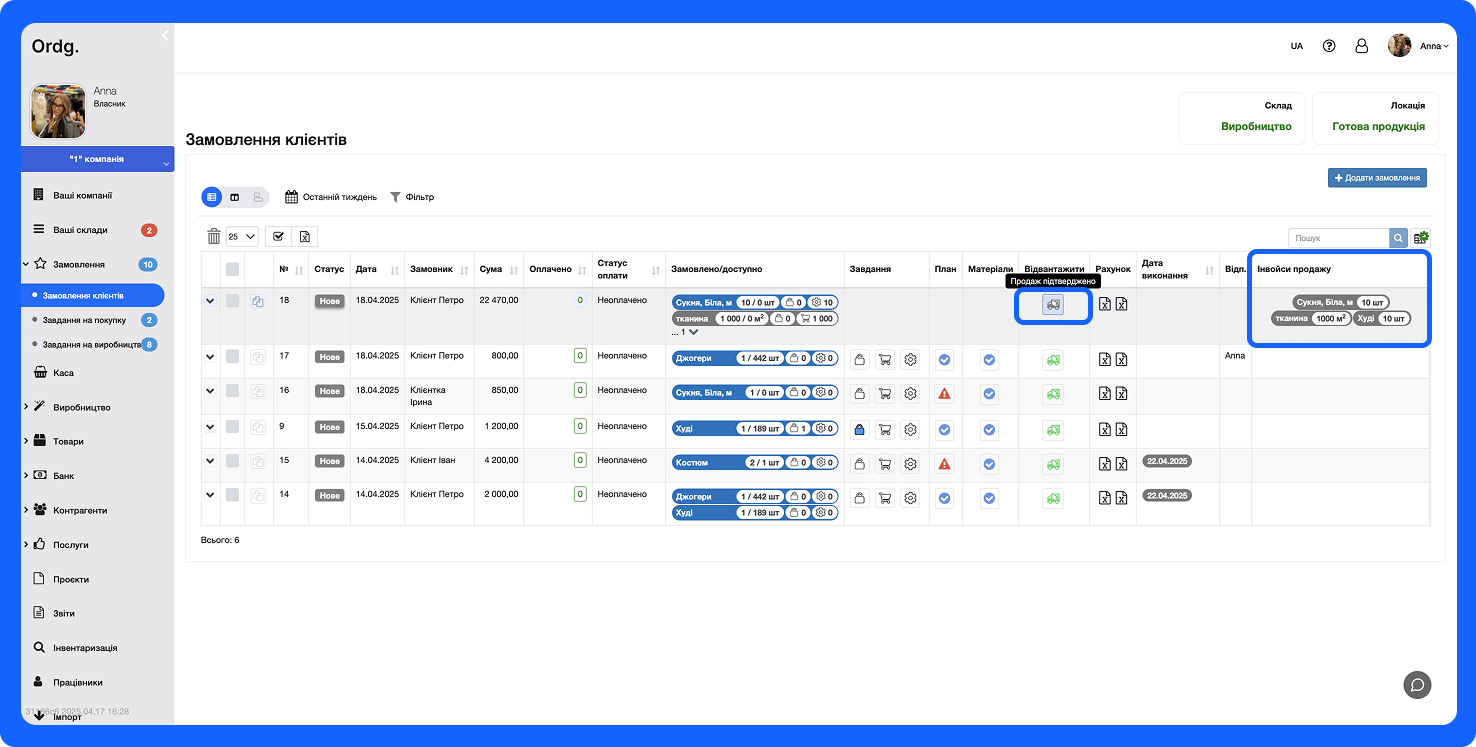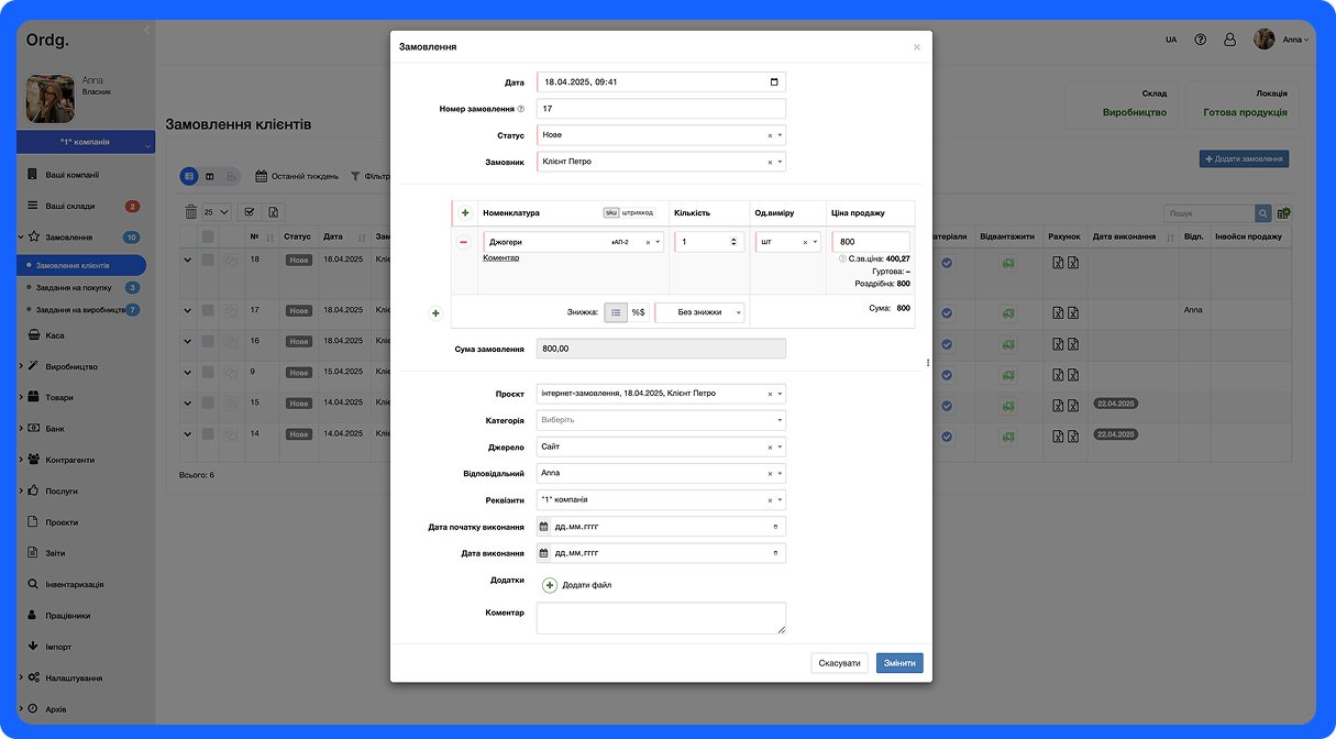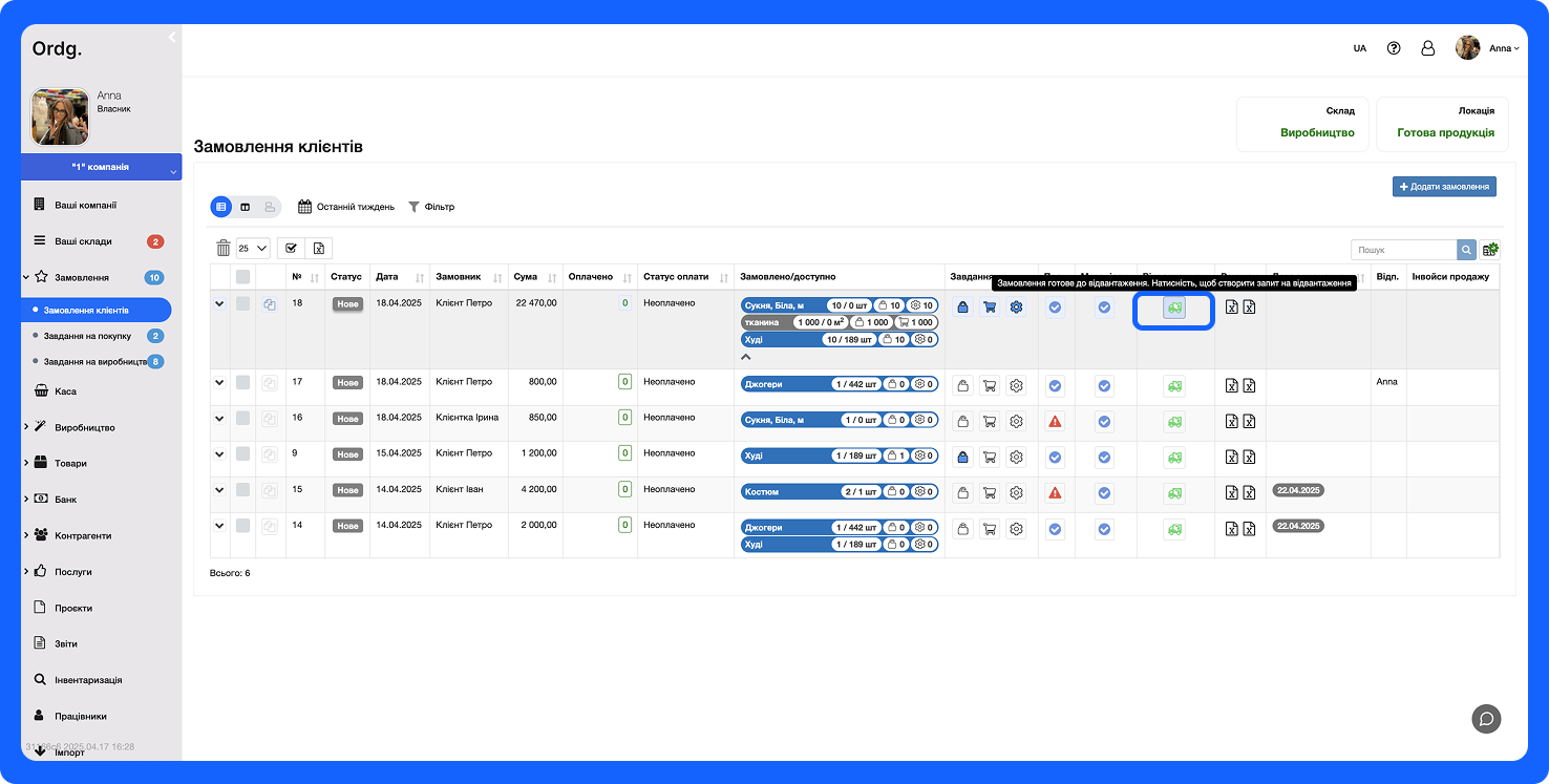 Замовлення клієнтів, це інструмент обліку замовлень, який дозволяє відслідковувати етапи замовлення і наявність товару на складі. Дає можливість планувати та створювати завдання на виробництво або покупку.