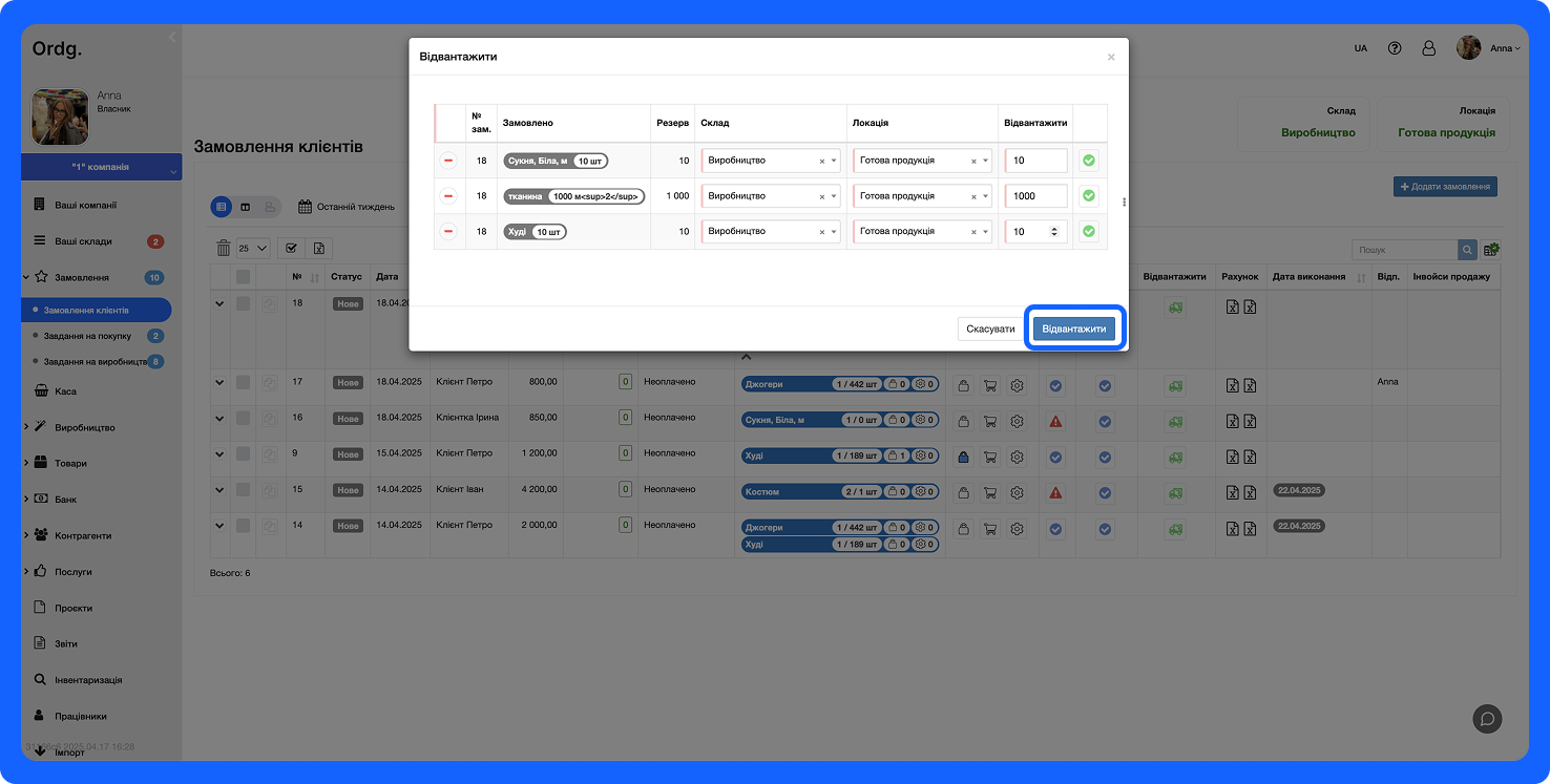 - Відвантажити (Кількість яка має бути відвантажена або ж доступна до відвантаження на цей момент. За потреби змініть кількість, щоб зробити часткове відвантаження товару)