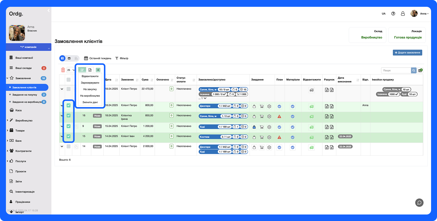 - Змінити дані (Зміна статусу, Відповідального, Замовника одразу до декількох замовлень. При виборі статусу, відповідального або замовника - відповідні дані зміняться на обрані до всіх обраних замовлень)