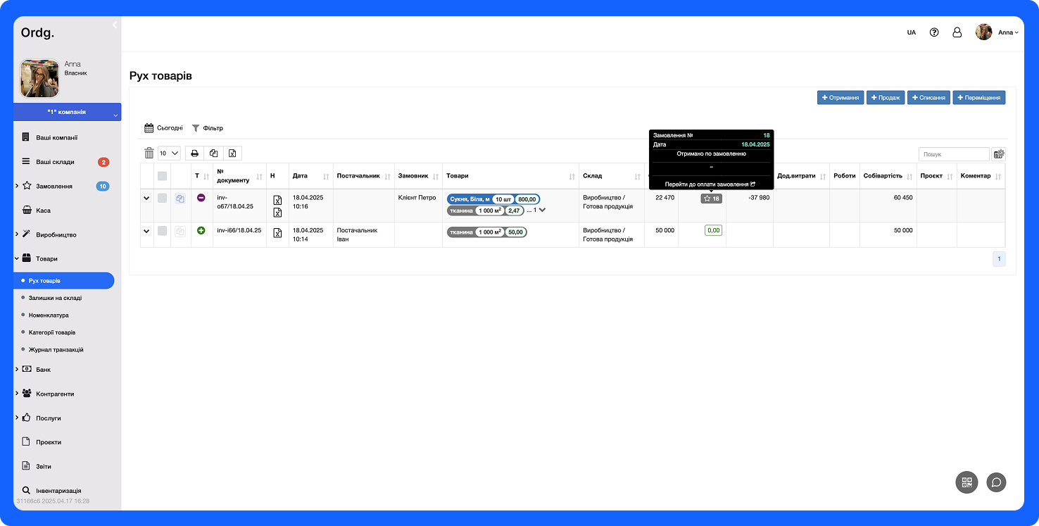 - Замовлено/доступно (кількість товару, що замовлено та загальна кількість, яка доступна на всіх складах)