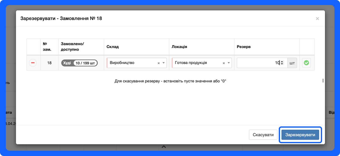 - Склад та локація (оберіть склад та локацію, на яких ви бажаєте зарезервувати товар)