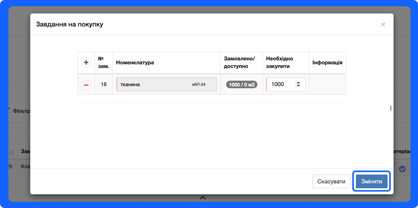 1. Натисніть на кнопку “🛒” у стовпчику “Завдання”, щоб відкрити форму “завдання на покупку”.