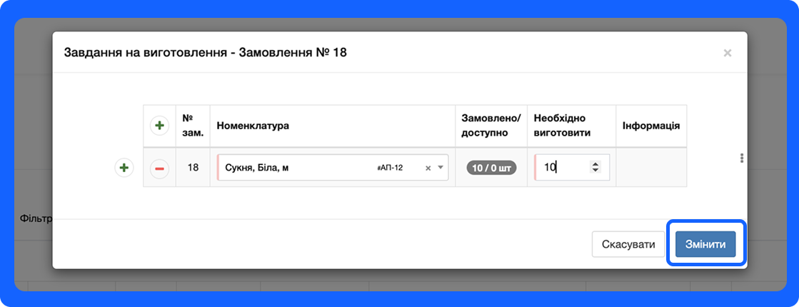 У відкритій формі одразу підтягнеться кількість виробу, яку необхідно виготовити, та якої недостатньо для відвантаження замовлення. За потреби збільшіть або зменшіть кількість.
