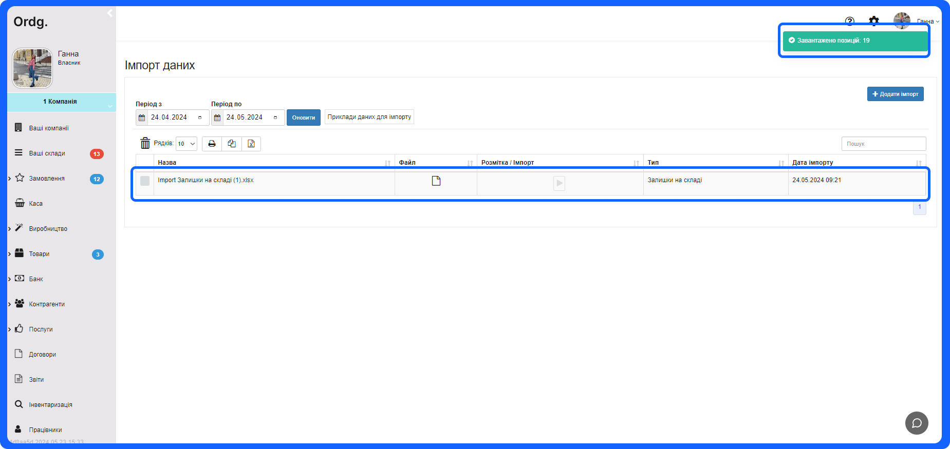 Після імпорту даних про залишки та специфікації - можна починати роботу у сервісі, а саме - створювати замовлення, отримувати, продавати, переміщувати та списувати товар та вести виробництво.