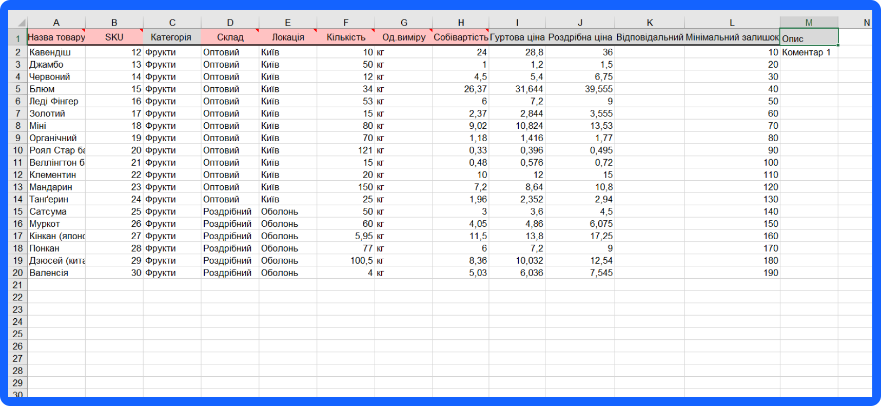 (у файл завантажуємо усі можливі позиції, які можуть бути на складі, це можуть бути матеріали, готові вироби, розхідники, тобто все те, що ми бажаємо обліковувати)