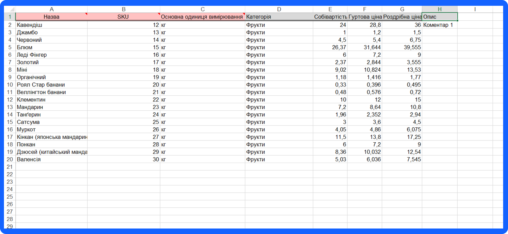 Інші поля, такі як категорія, гуртова ціна, роздрібна ціна, собівартість та опис - є не обов'язковими для заповнення, але ви можете внести у ці поля наступну інформацію: