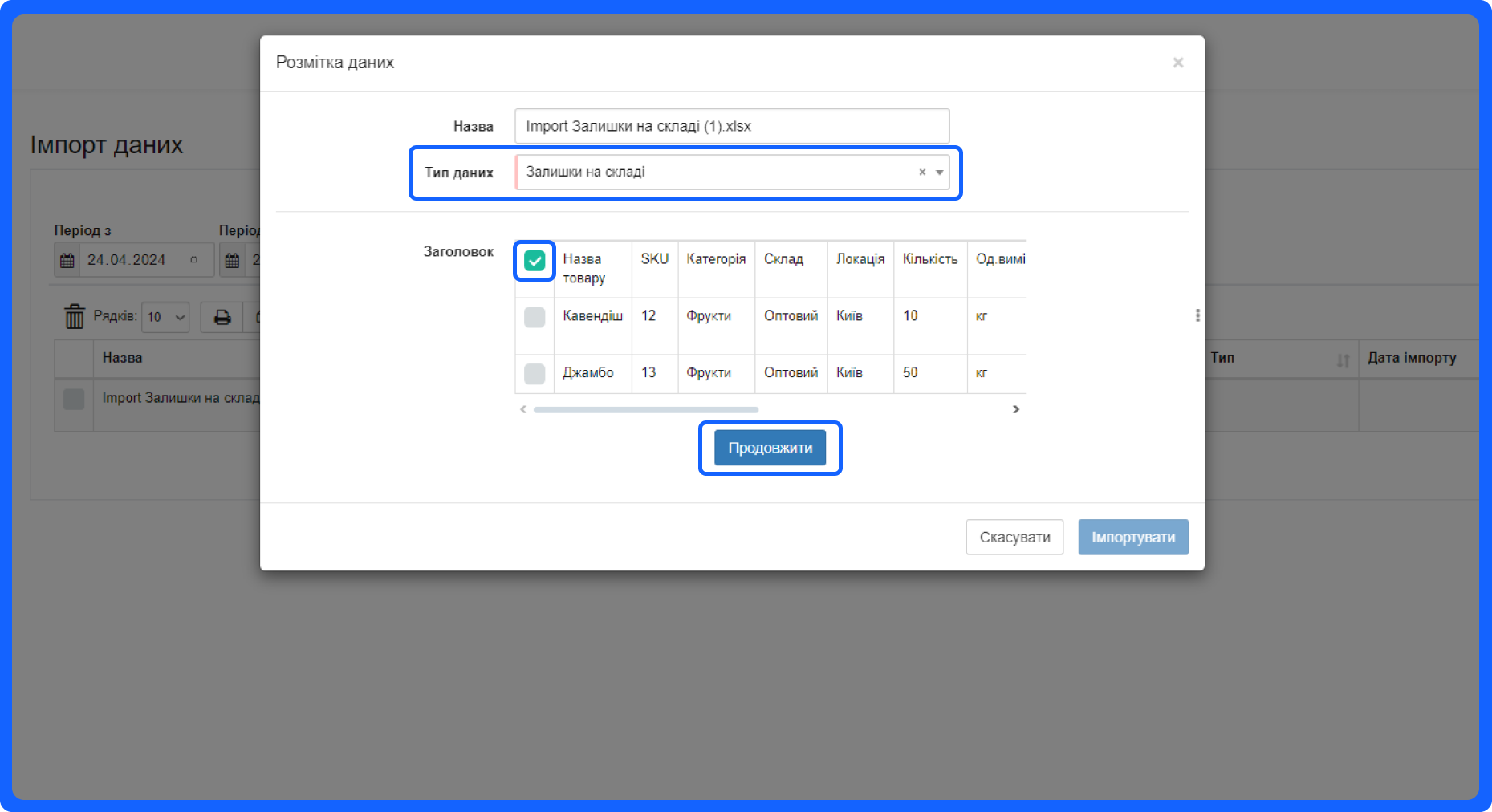 6. Позначте рядок, що відповідає за заголовок полів та натисніть “Продовжити”