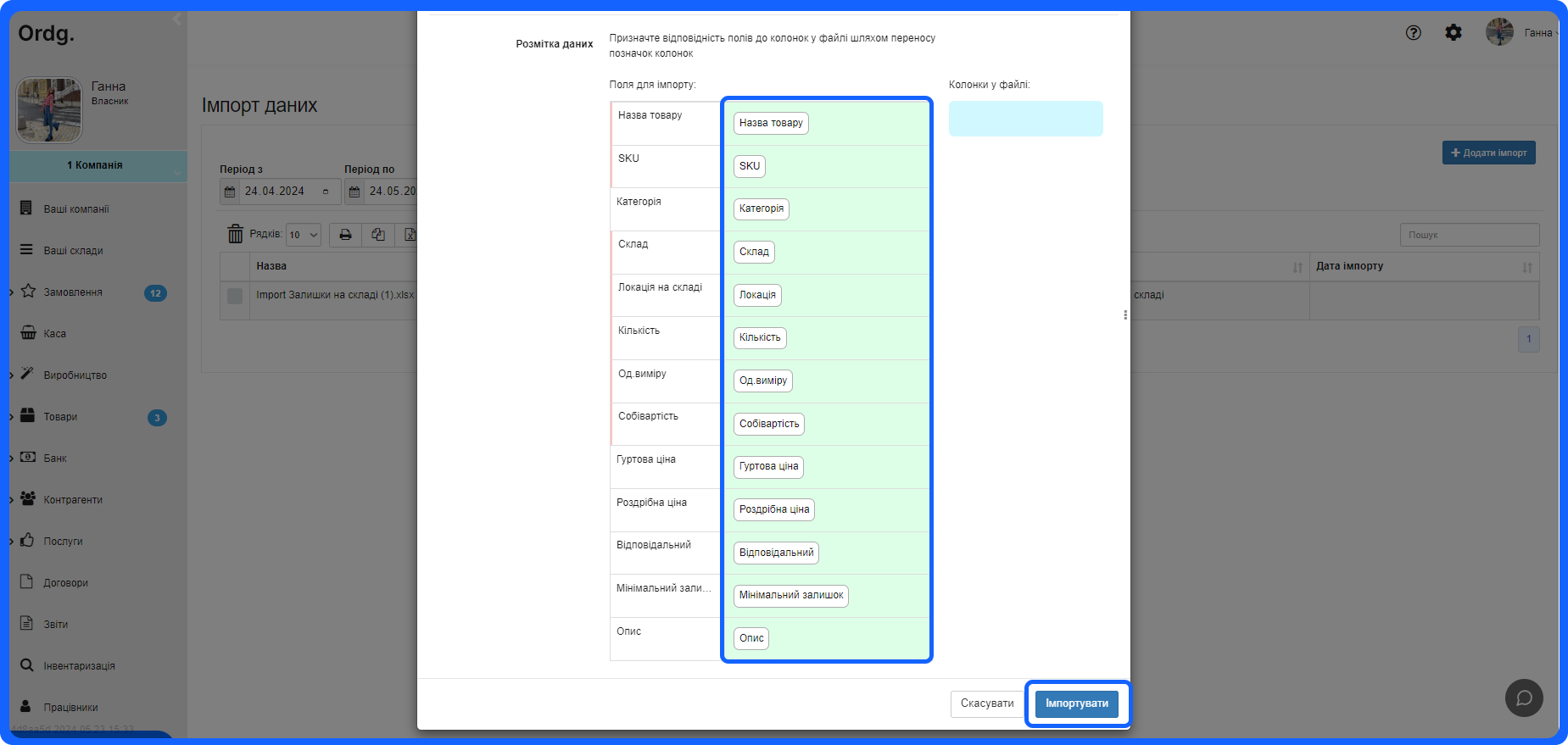 7. Призначте відповідність полів до колонок у файлі шляхом переносу позначок колонок