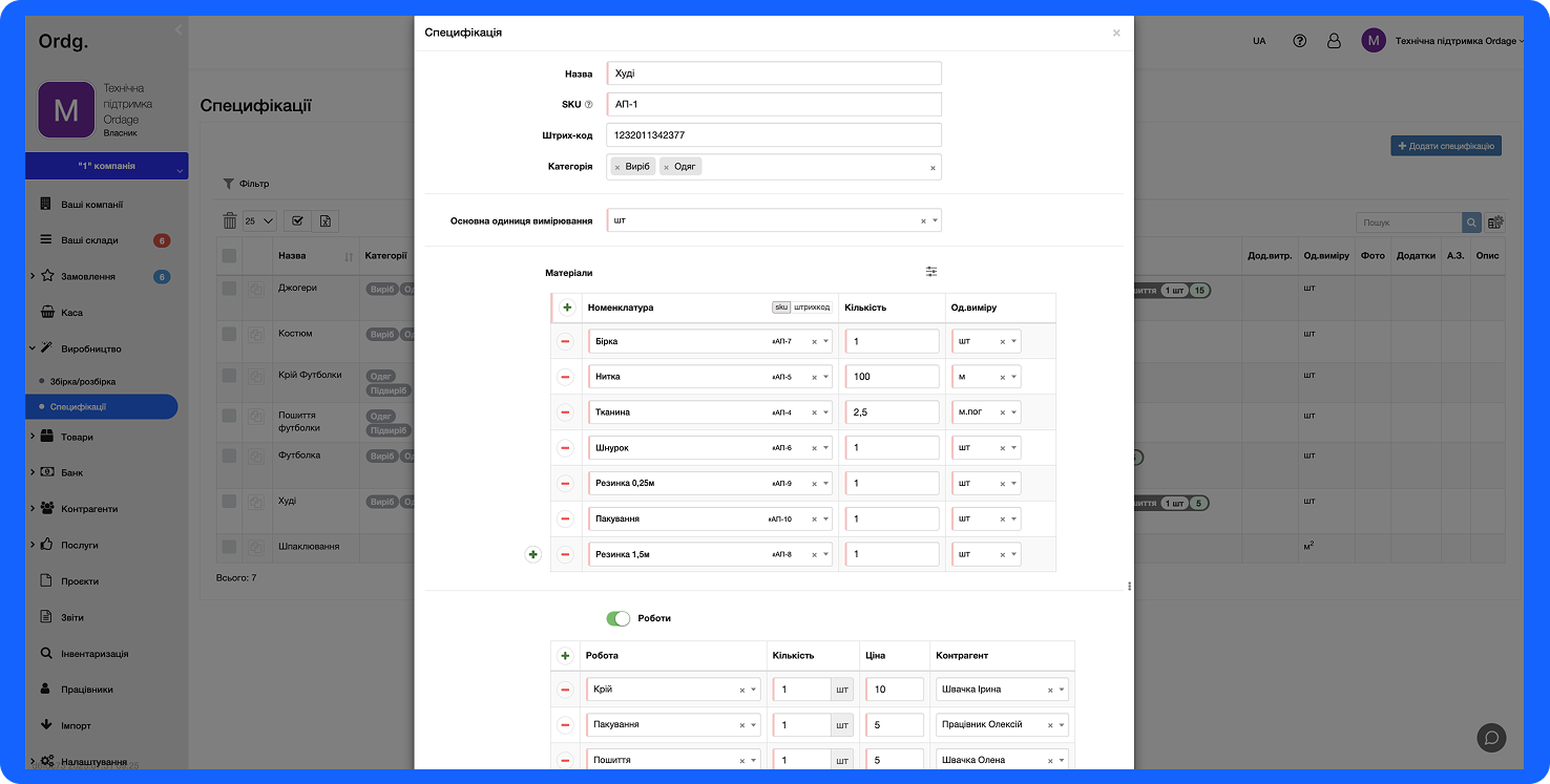 Специфікація - це технічна карта виробу, у якій ми вказуємо з чого складається 1 виріб, наприклад, на виготовлення 1 сукні ми маємо витратити 1,5 метри тканини та 40 метрів ниток. Також, якщо наші працівники мають заробітну плату за виготовлену одиницю - ми можемо додати роботи до специфікації, щоб врахувати їх у собівартість виробу. Наприклад, під час пошиття сукні йдуть наступні роботи: крій, пошив та пакування. Їх роблять 3 окремих працівника, тому роботи ми вносимо окремо та вказуємо скільки ми маємо заплатити працівнику за крій 1 сукні, за пошиття 1 сукні, та за пакування 1 сукні. За потреби, якщо цю роботу завжди виконують одні й ті самі працівники - можна вказати у полі “Контрагент” необхідного працівника (якщо працівники ще не додані - натисніть на поле “Контрагент” та “+ додати працівника”. У формі вкажіть імʼя та тип “Працівник”.
