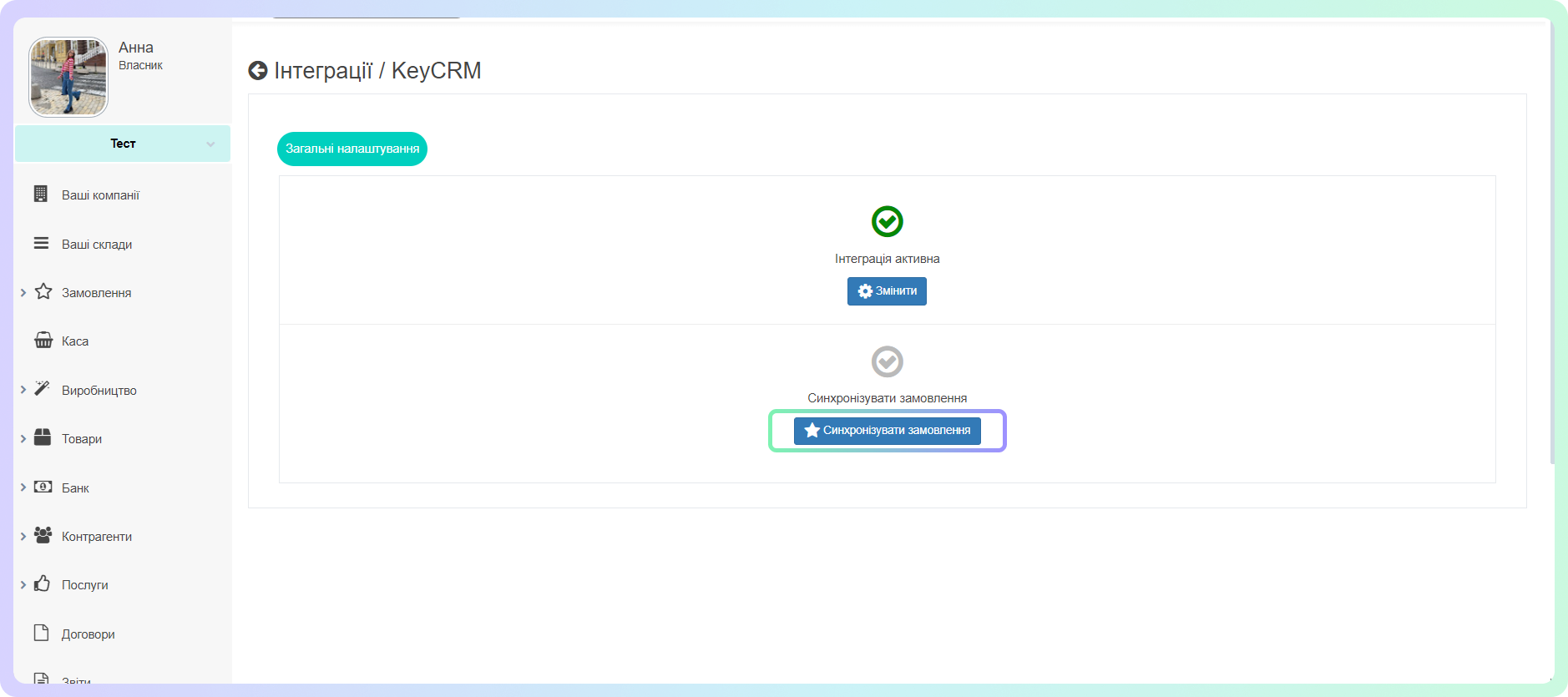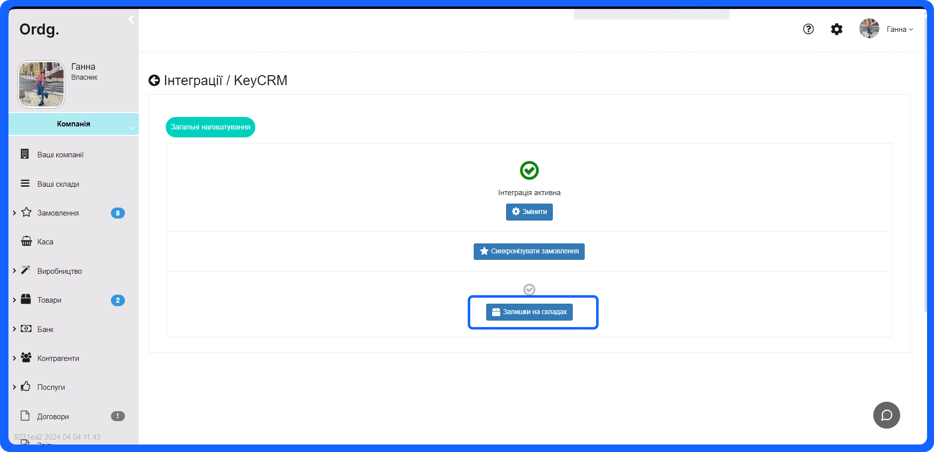 У Ordage відкрийте Налаштування -> Інтеграції -> KeyCRM -> Змінити.