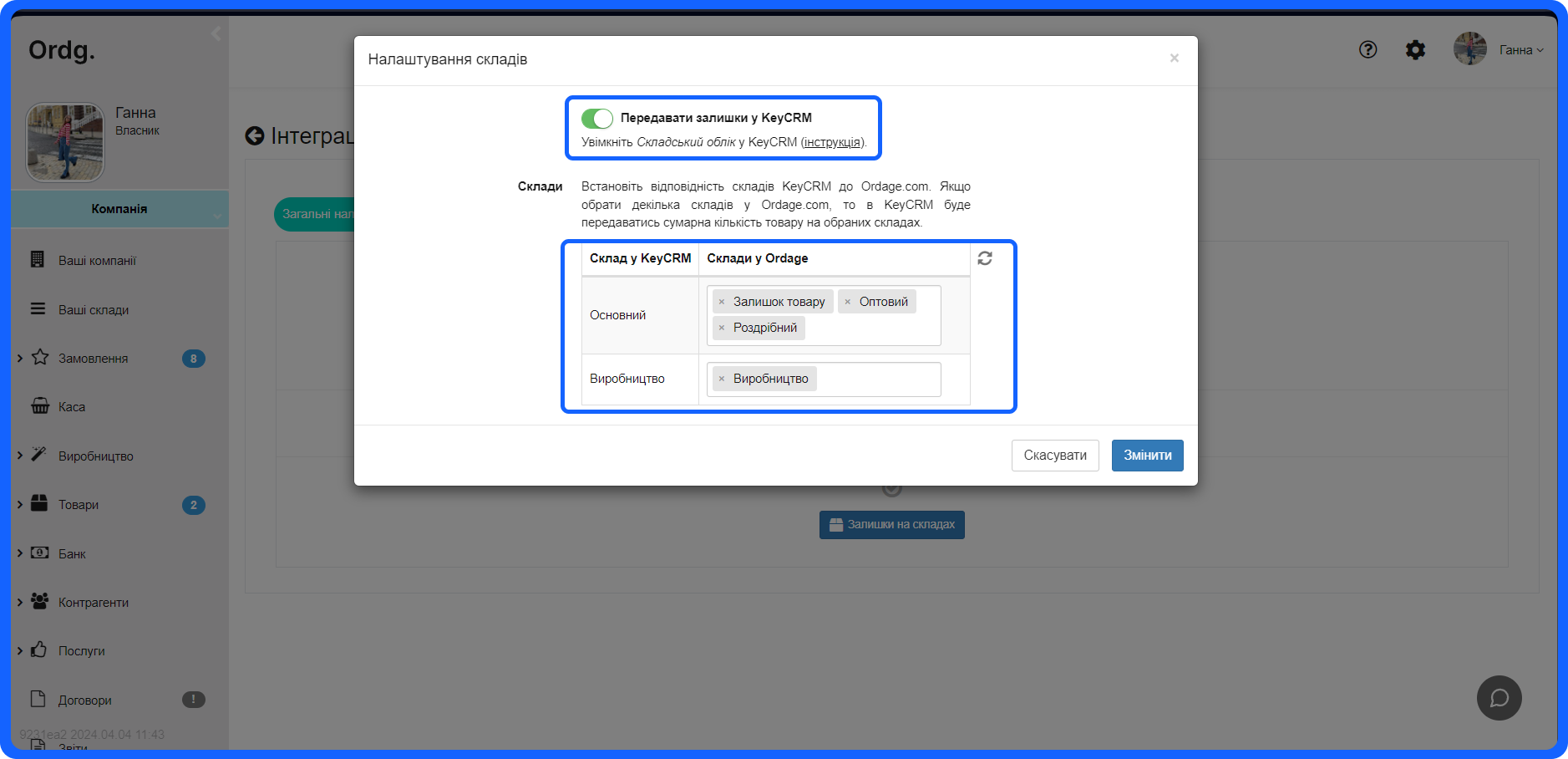 Після збереження, коли в Ordage приходитиме замовлення з товаром - залишок по цьому товару автоматично буде оновлюватись в KeyCRM.