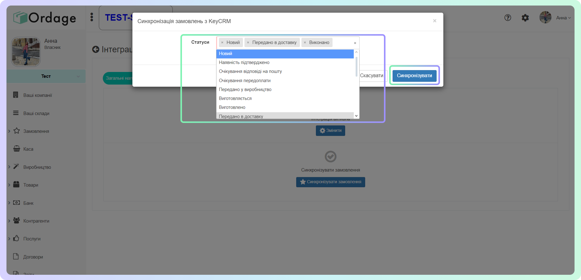 Якщо у вас є раніше створені активні замовлення в KeyCRM, натисніть "Синхронізувати замовлення" в Ordage та оберіть за якими статусами замовлень синхронізувати. Це дозволить перенести замовлення тільки з обраними статусами в Ordage.