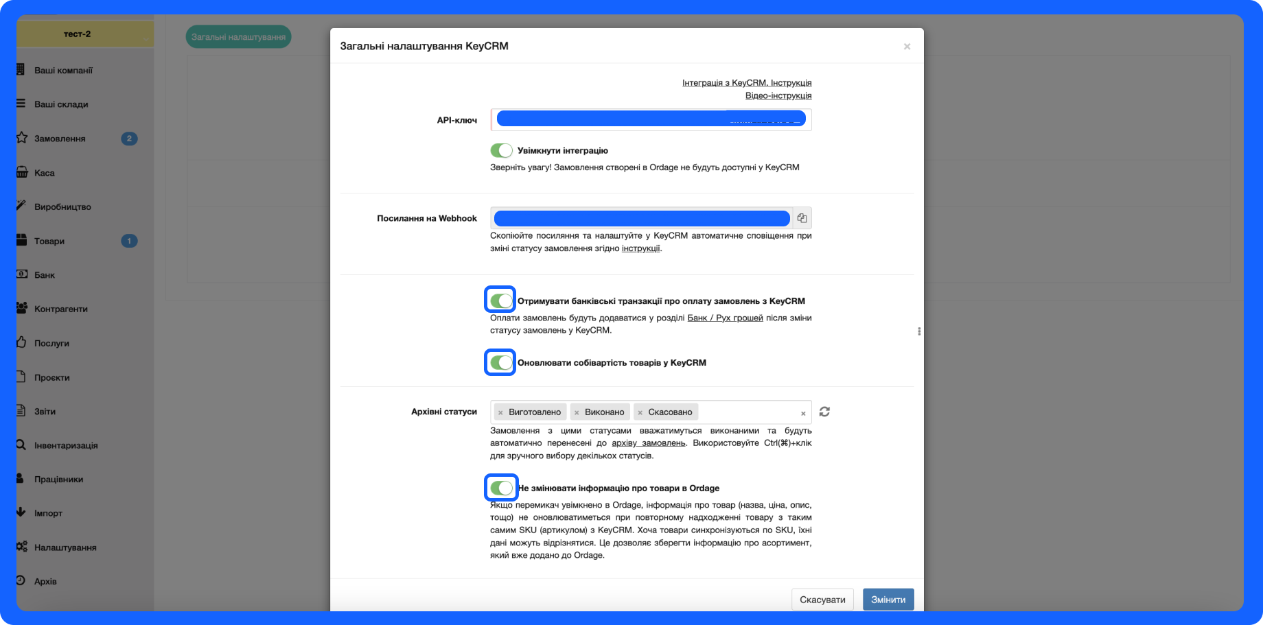 Вставте API ключ з KeyCRM (знаходиться в розділі Налаштування -> Основні -> Згенерувати API ключ). Та вставте АРІ ключ в Ordage та увімкніть перемикач -> Увімкнути інтеграцію.