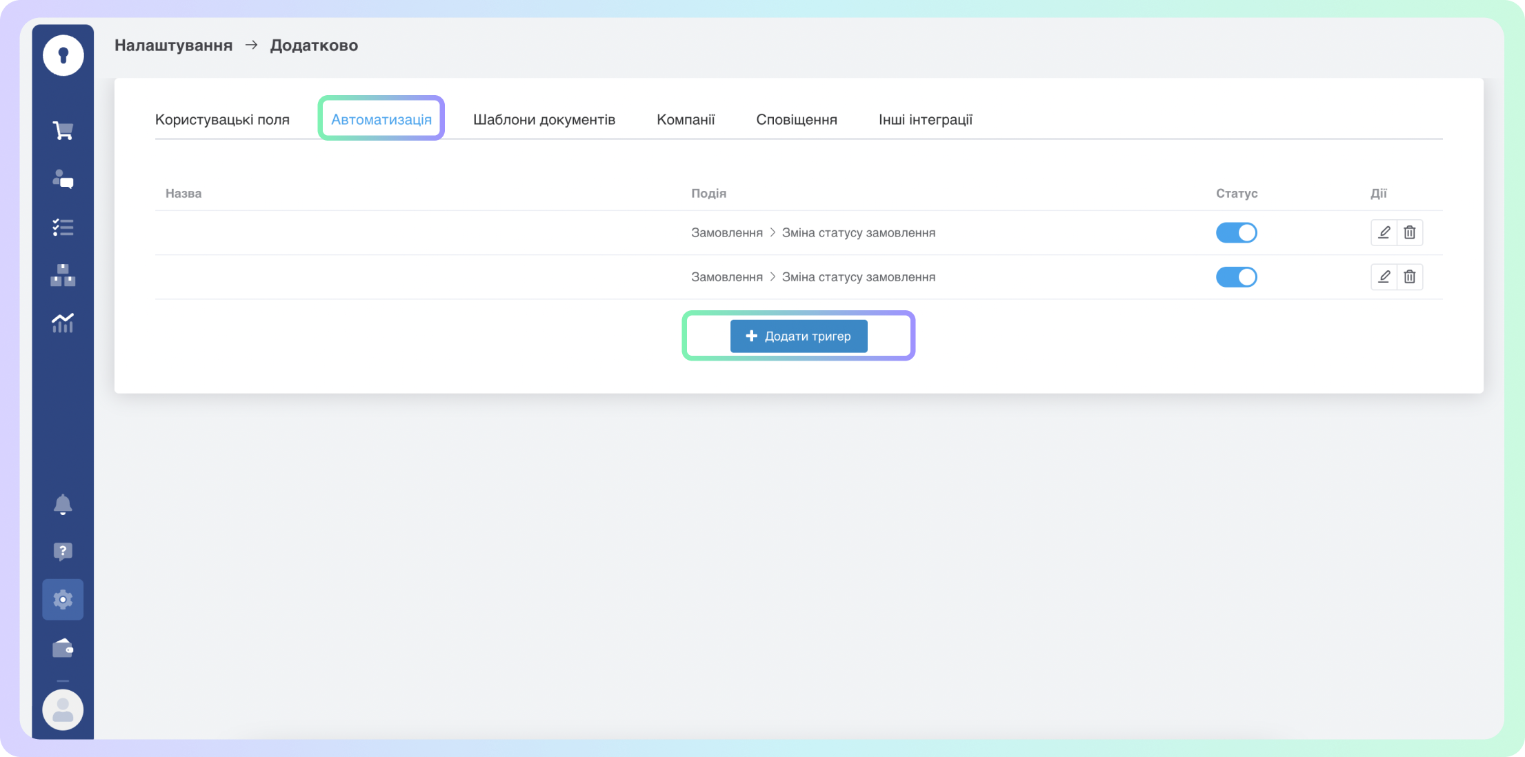 Перейдіть в розділ KeyCRMНалаштування -> Додатково -> Автоматизації.
