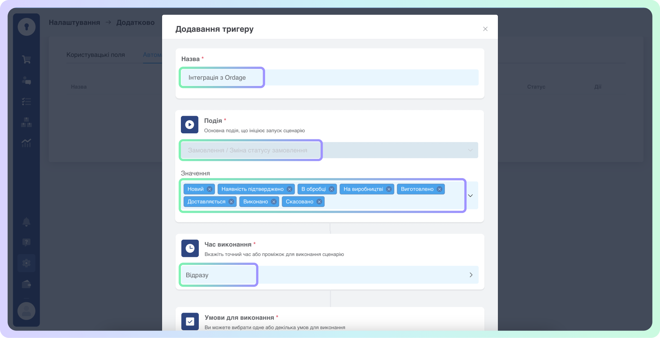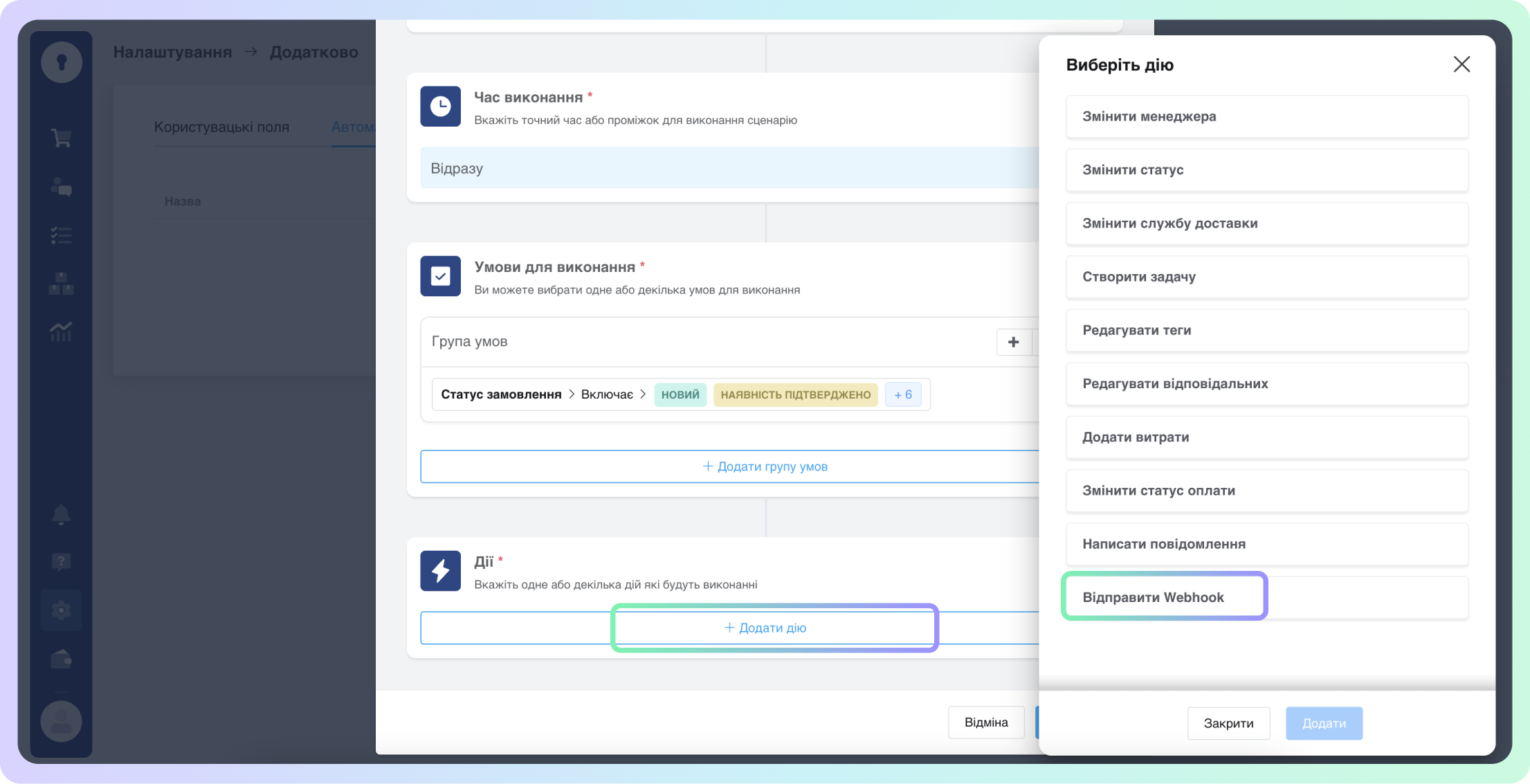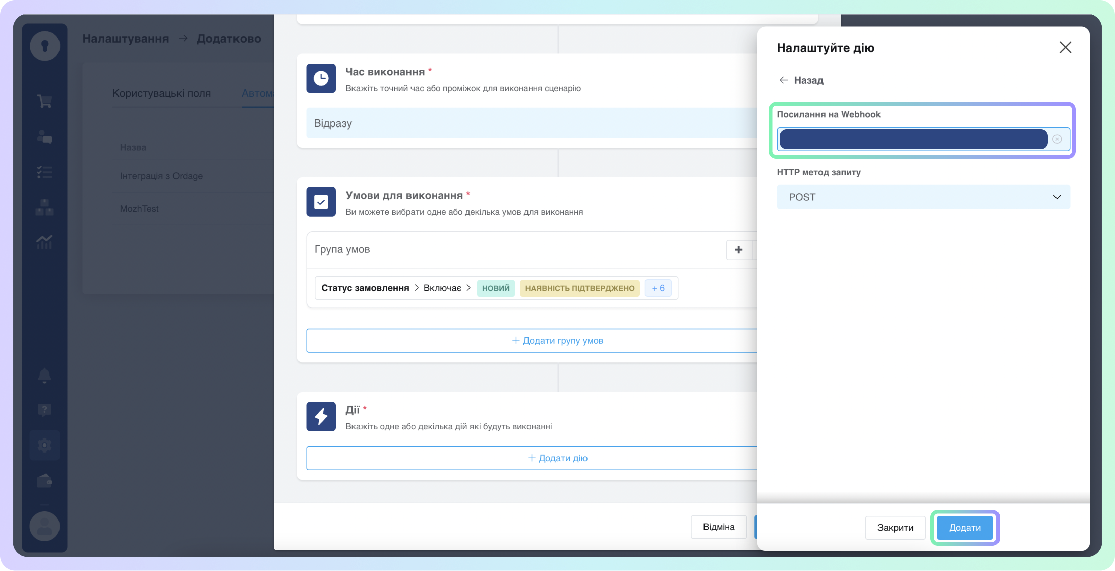 Дії: оберіть "Відправити вебхук" та вставте скопійований вебхук з Ordage (розділ "Налаштування" -> "Інтеграції" -> "KeyCRM" -> "Увімкнути інтеграцію").