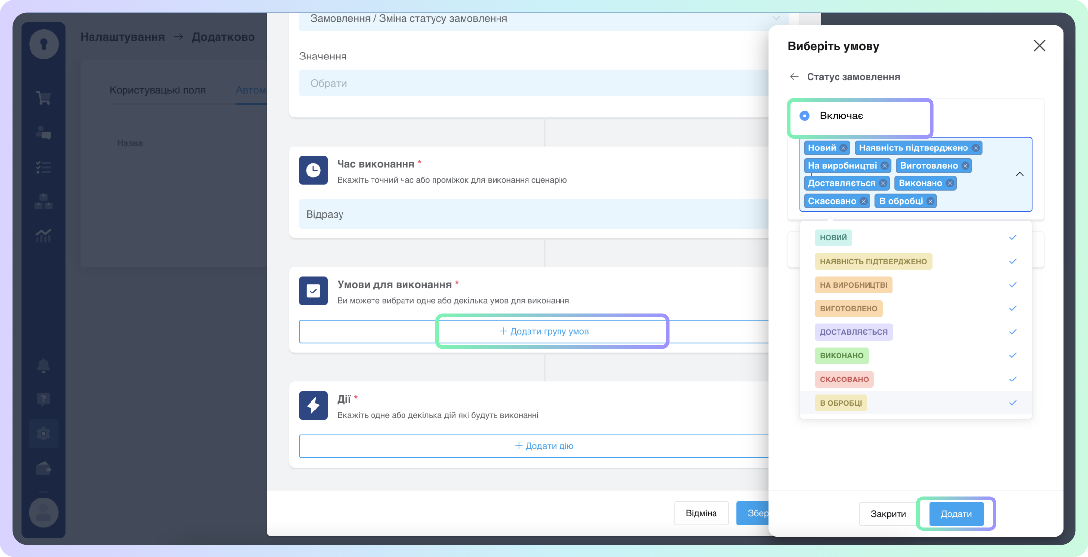 Умови для виконання: оберіть статуси та перелік необхідних статусів.