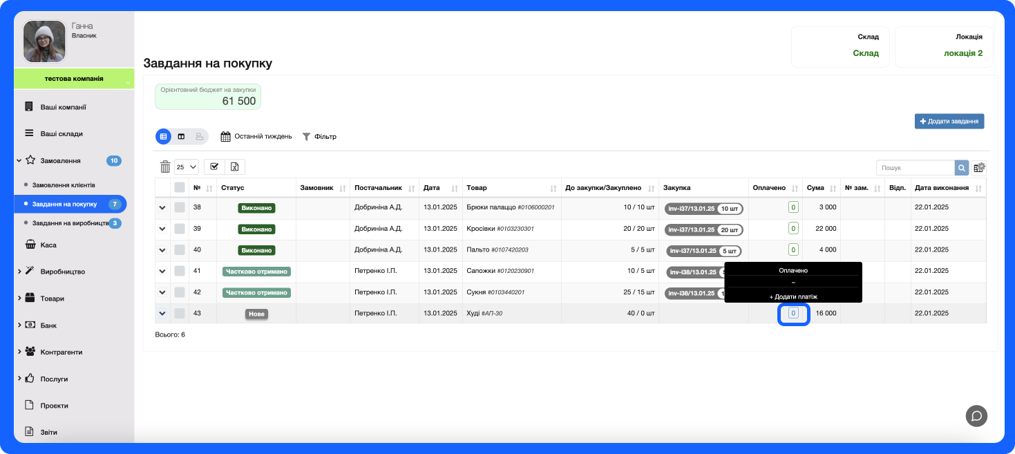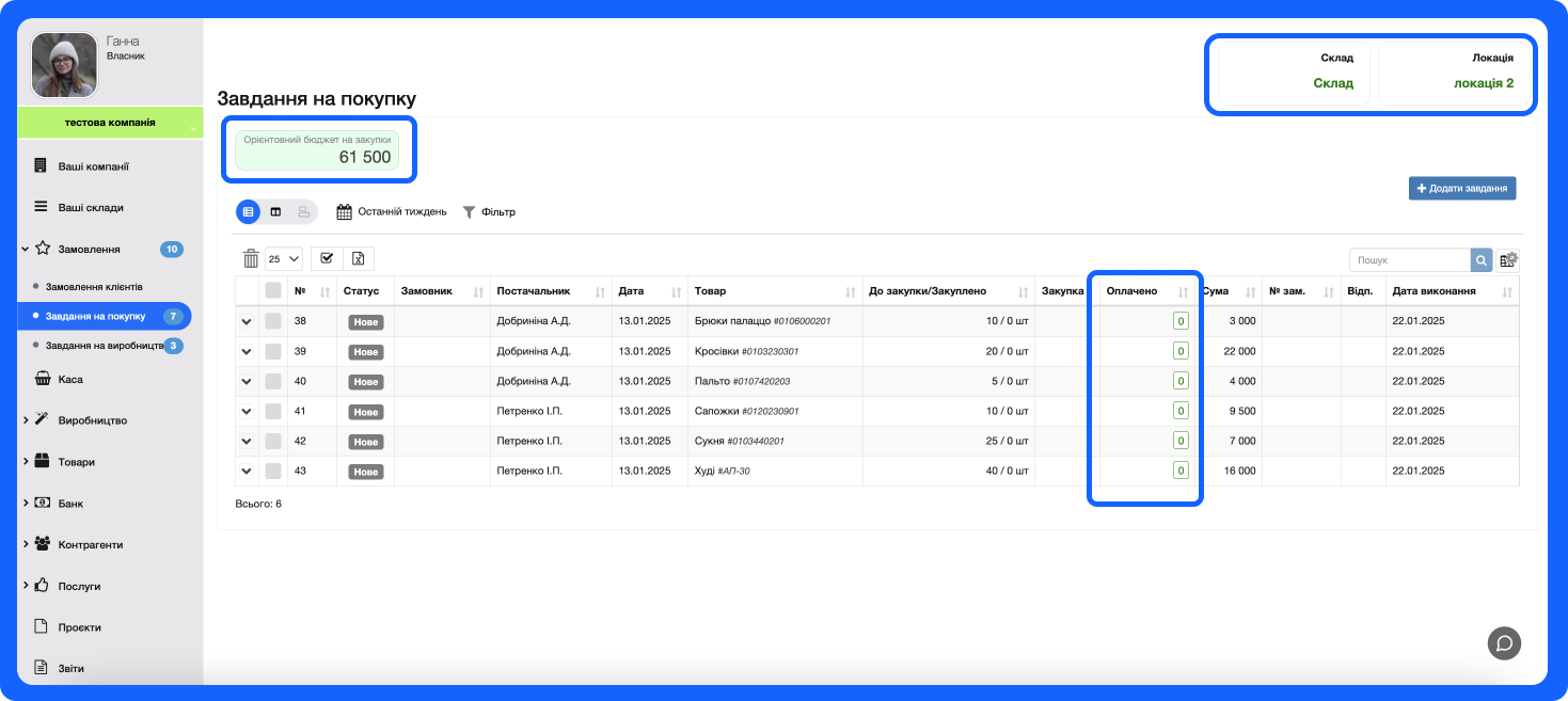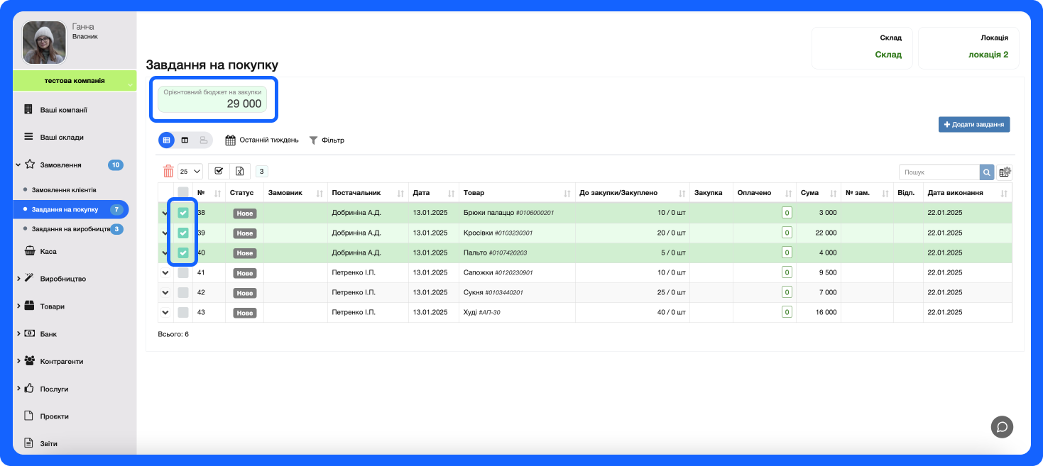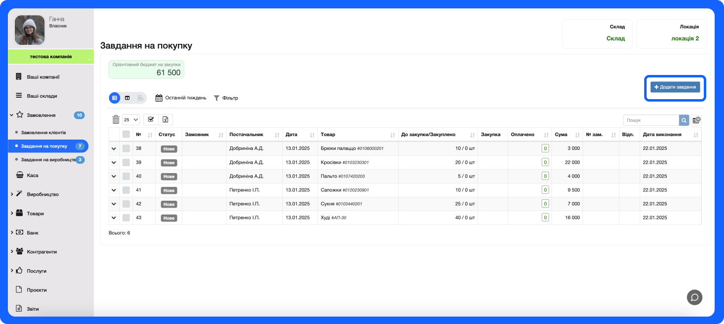 Завдання на покупку є корисним функціоналом для планування закупівлі матеріалів або готових товарів.