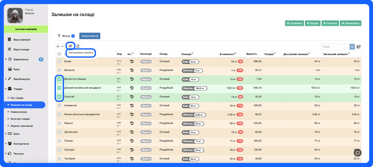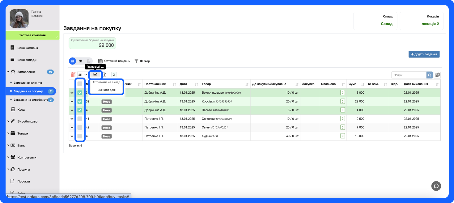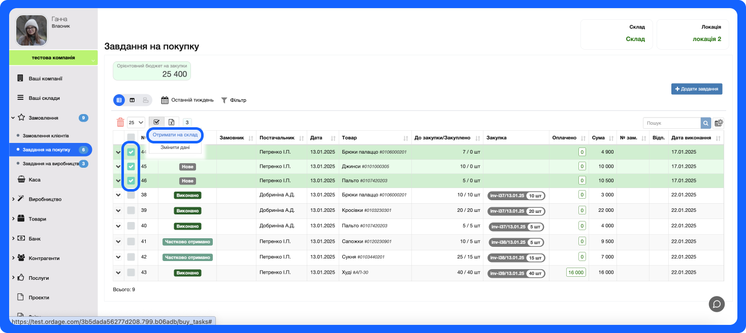 - Для того, щоб отримати товар на склад, оберіть чекбоксами товари, які потрібно отримати.