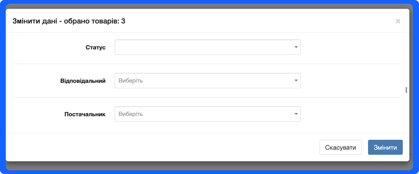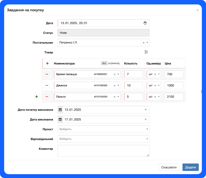1.3. Додаткові поля: постачальник, ціна (ціна закупівлі за одиницю), дата початку виконання та дата виконання, проєкт, відповідальний, коментар — заповнюються за потреби та не є обовʼязковими.
