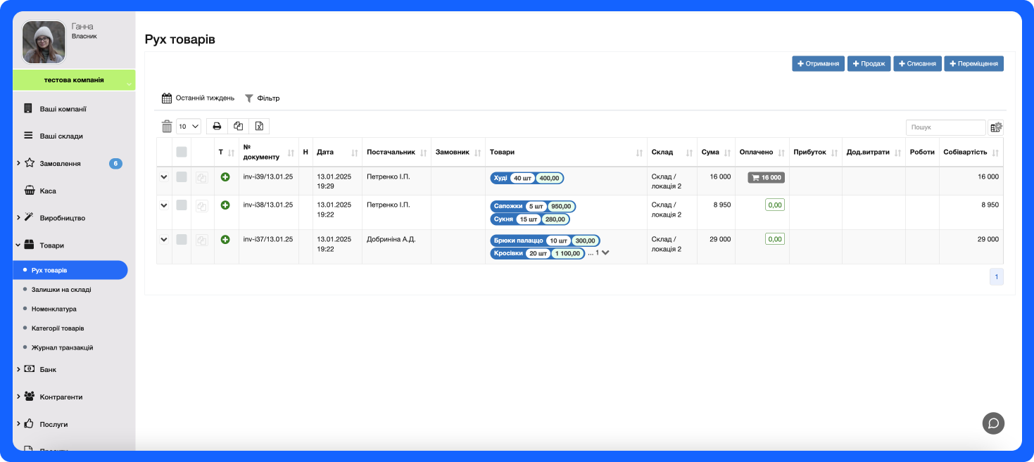 - Після цього у розділі «Рух товарів» формується запис про отримання товару.