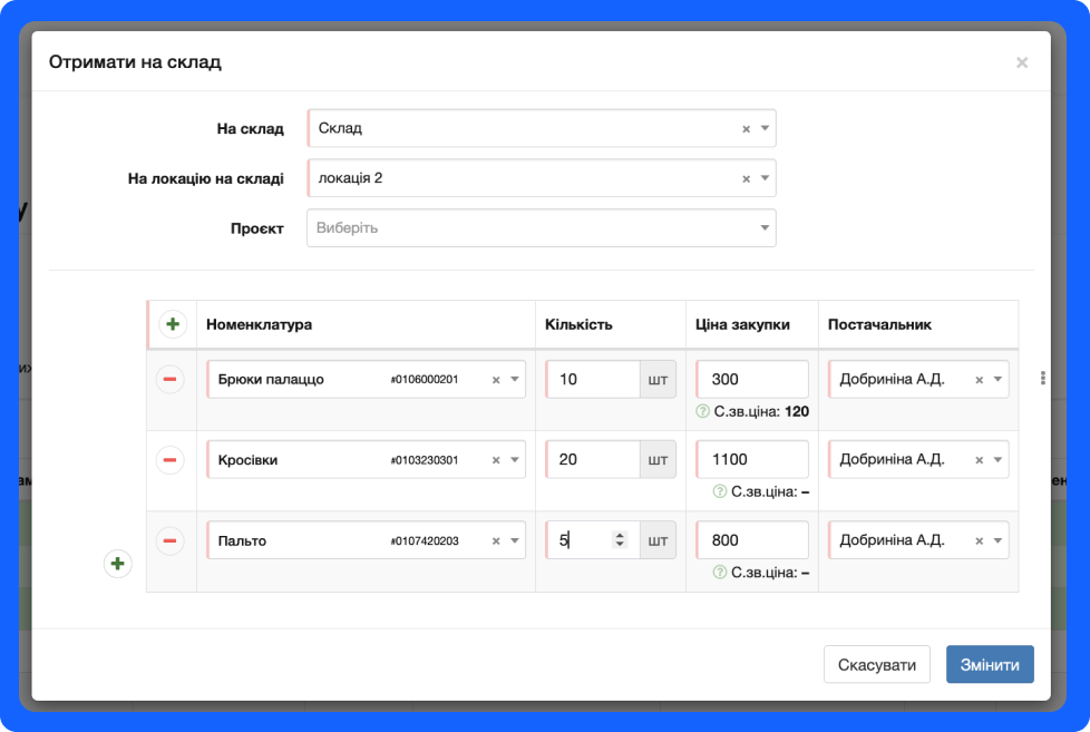 2.1 Поля “Склад” та “Локація” необхідні для швидшого заповнення однойменних полів під час отримання товару.